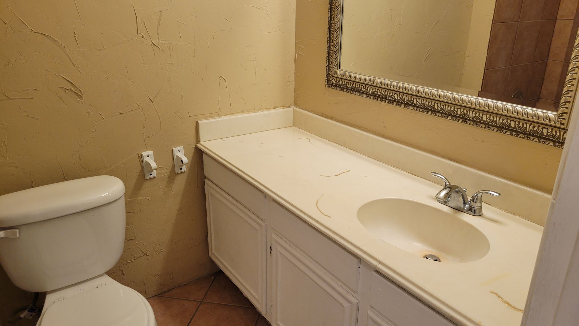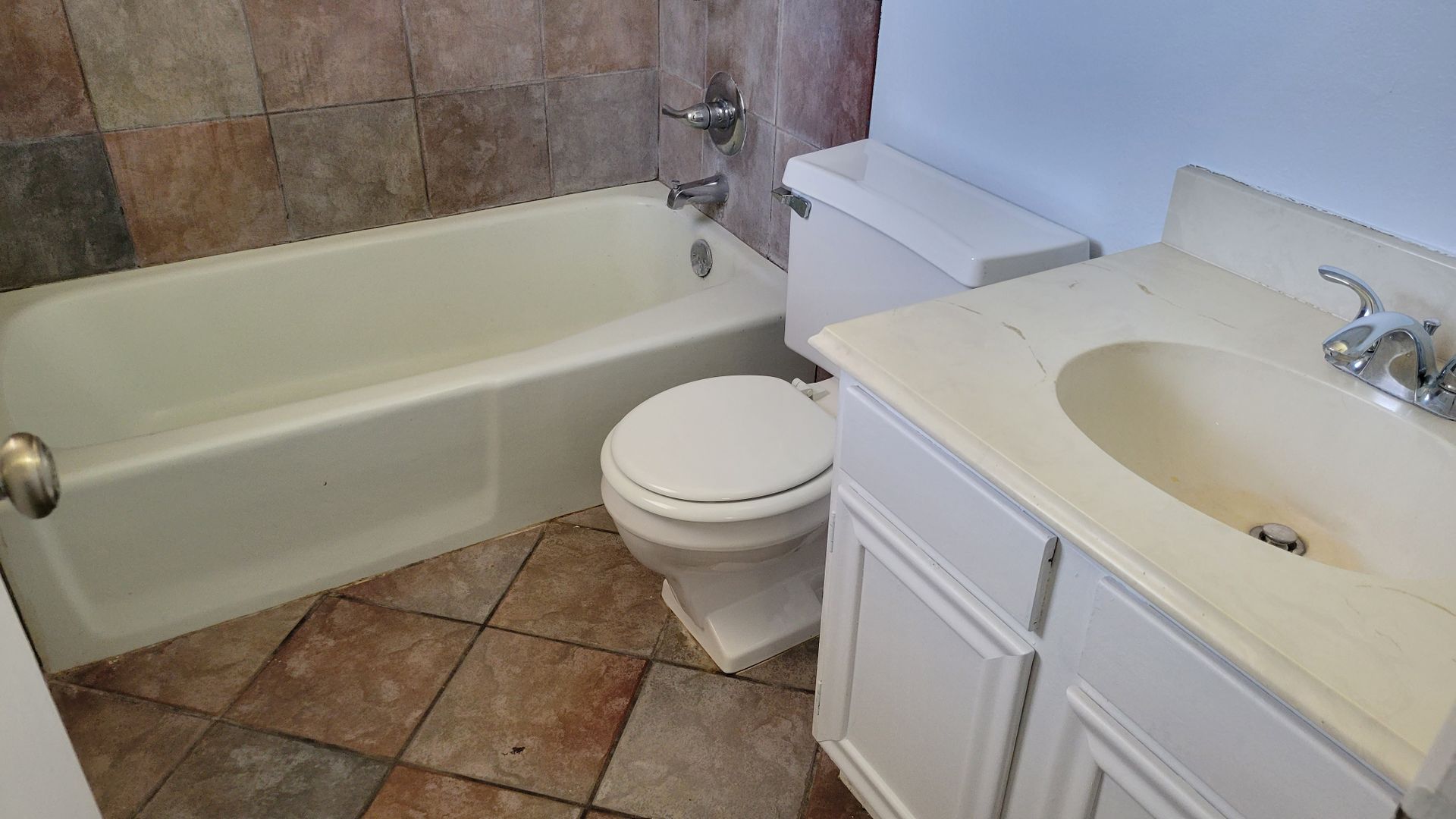 -Bathrooms both have tiled shower tub combo and single vanity with brush nickel hardware and fixtures