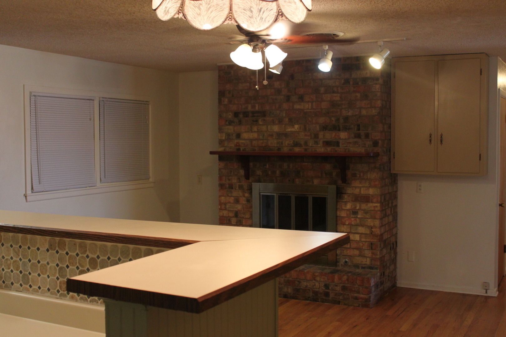 -Living Room 2: Open concept with kitchen, wood floors and a fireplace