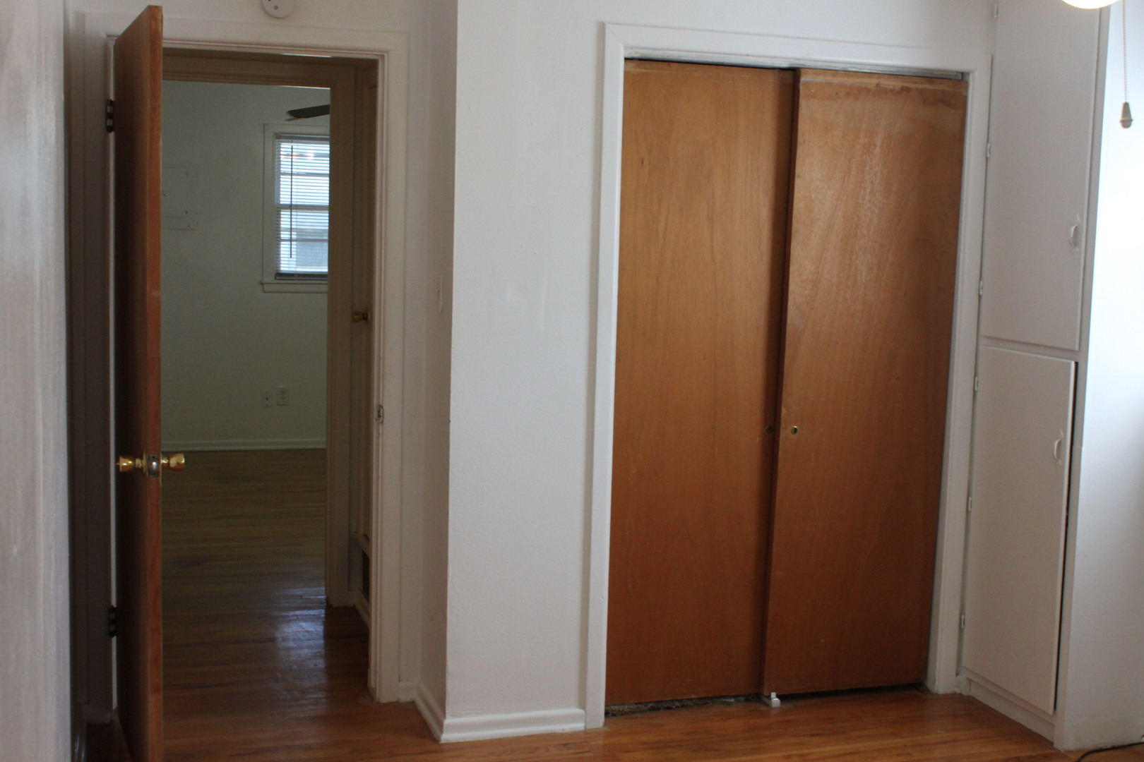 -Bedroom 1: Large bedroom with wood floors, fan with light kit and large windows with blinds, 2 closets