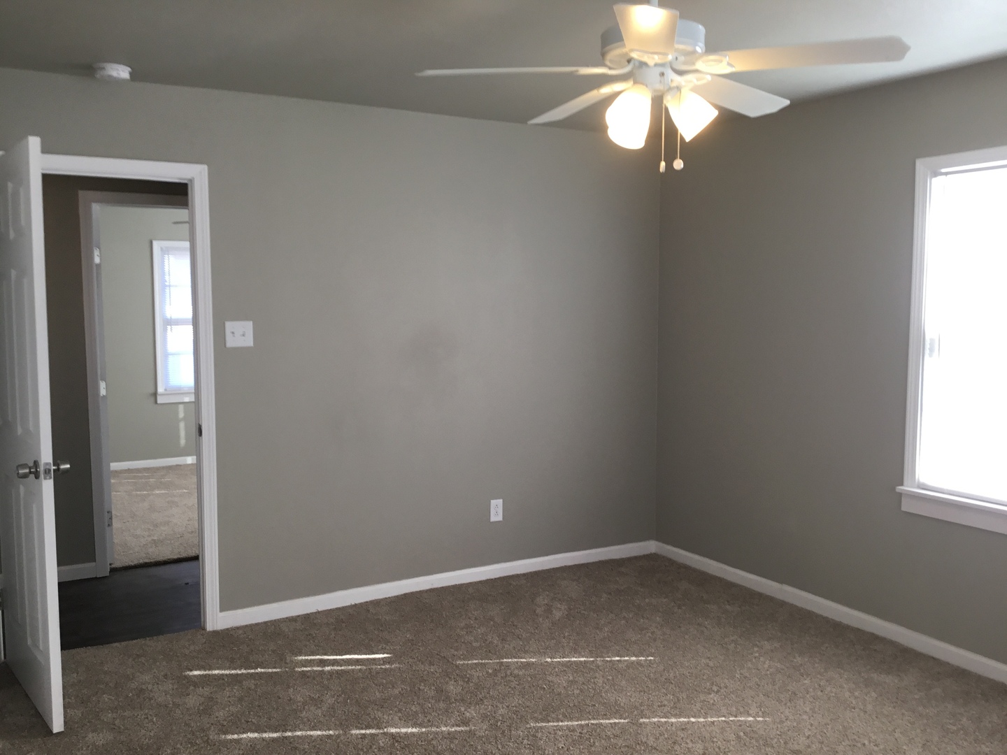 - Master Bedroom: Large bedroom with new carpet, new fan with light kit and large window with blinds. Huge walk in closet!