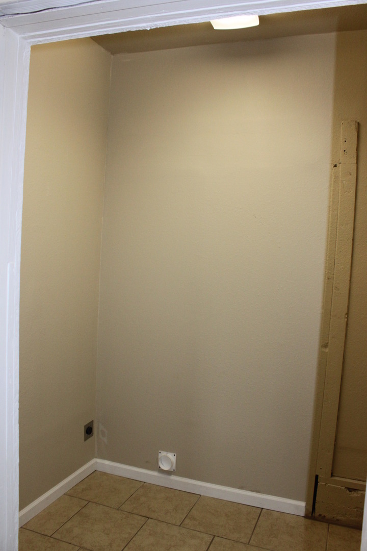 Large Laundry Room with tiled floors, washer & dryer hookup connections and extra storage.
