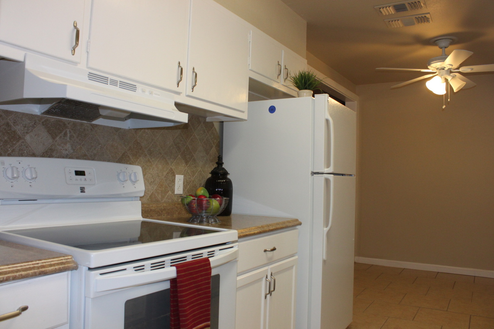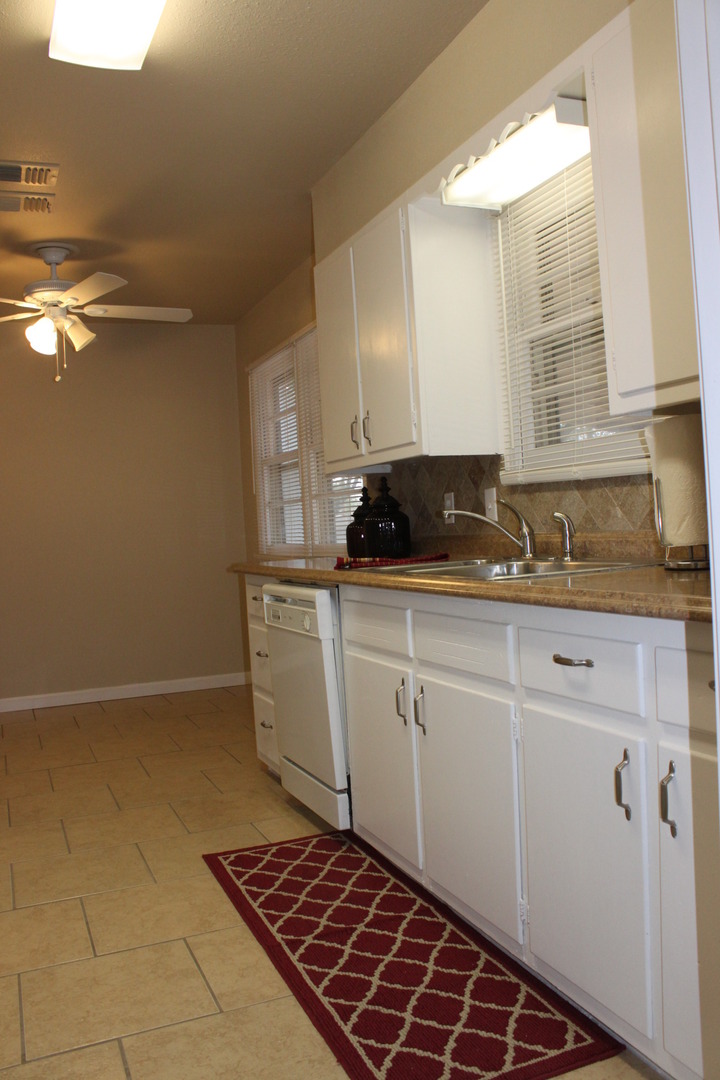 Great kitchen with tile flooring and backsplash, updated neutral counter tops, stainless sink!
