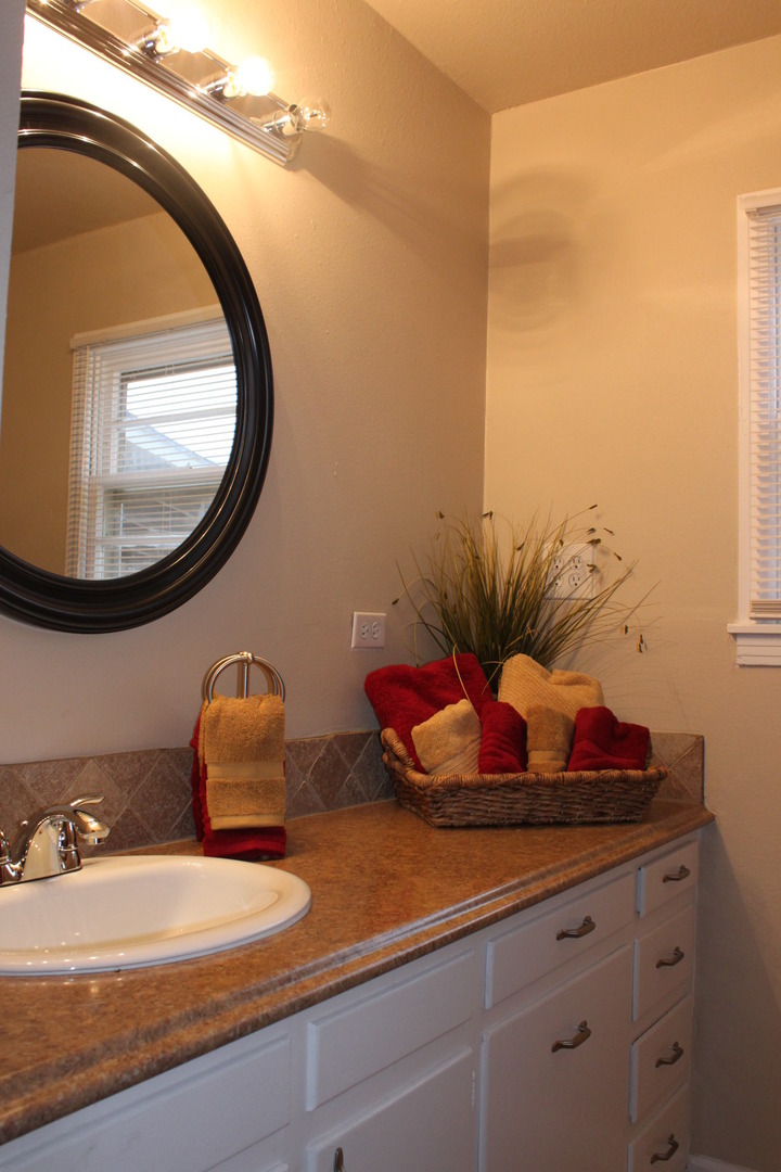 Bathroom includes a tiled shower/tub combo, tile floors, updated vanity & vanity top, updated mirror, updated faucets & vanity light, plenty of cabinet and storage space and updated hardware.