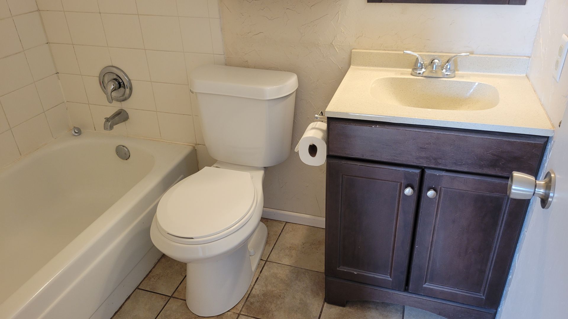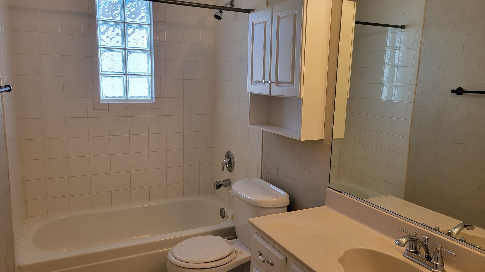 -Bathrooms both have tiled shower tub combo and single vanity with brush nickel hardware and fixtures