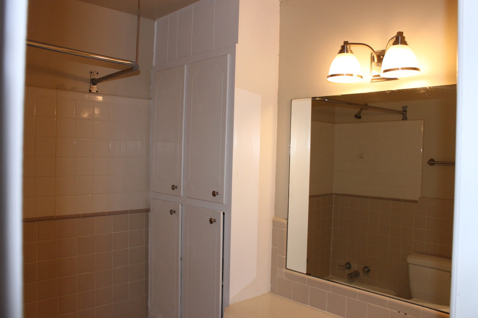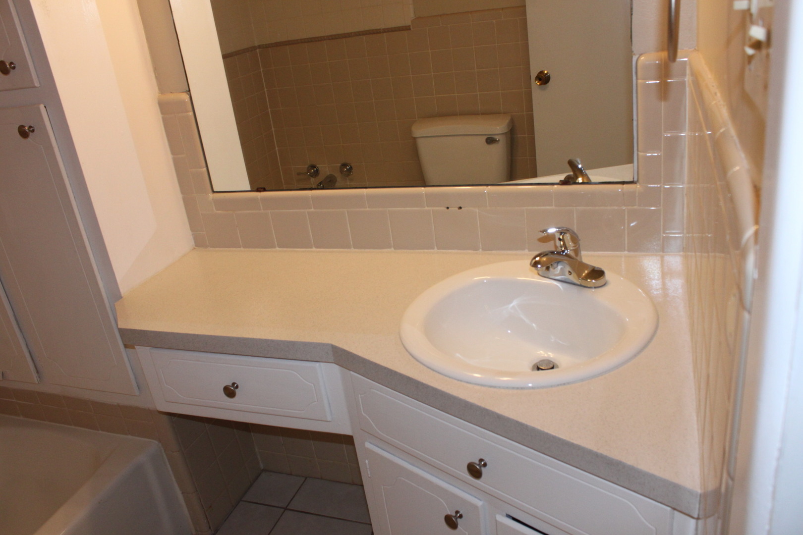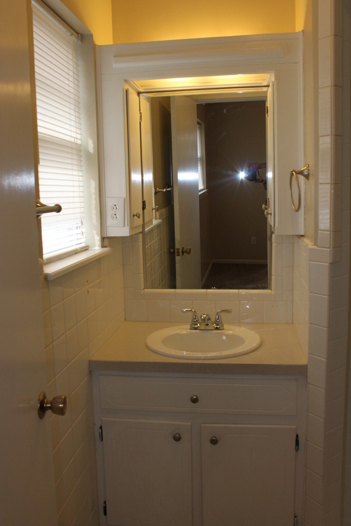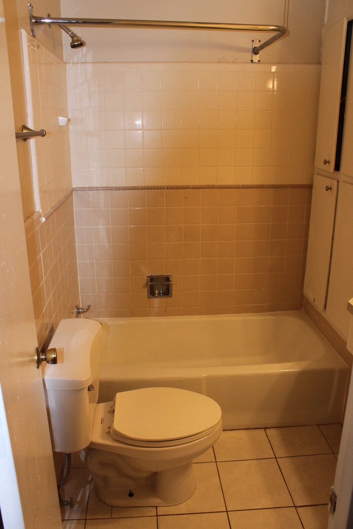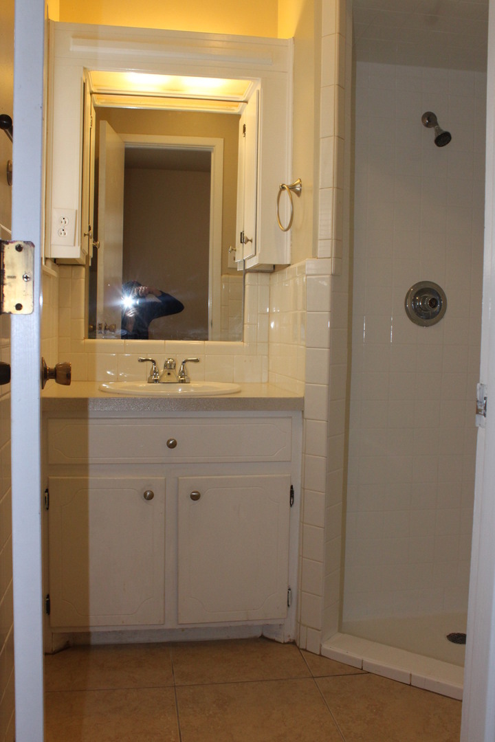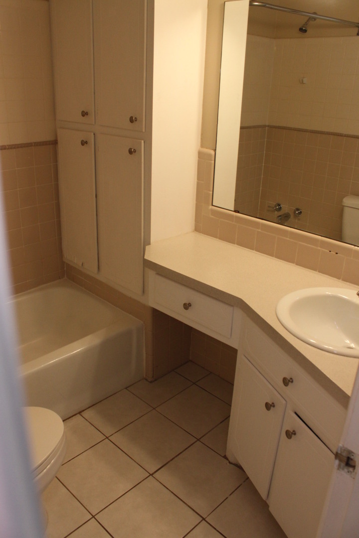 Hall bath has tiled floors, tiled shower/tub combo and extra cabinet storage