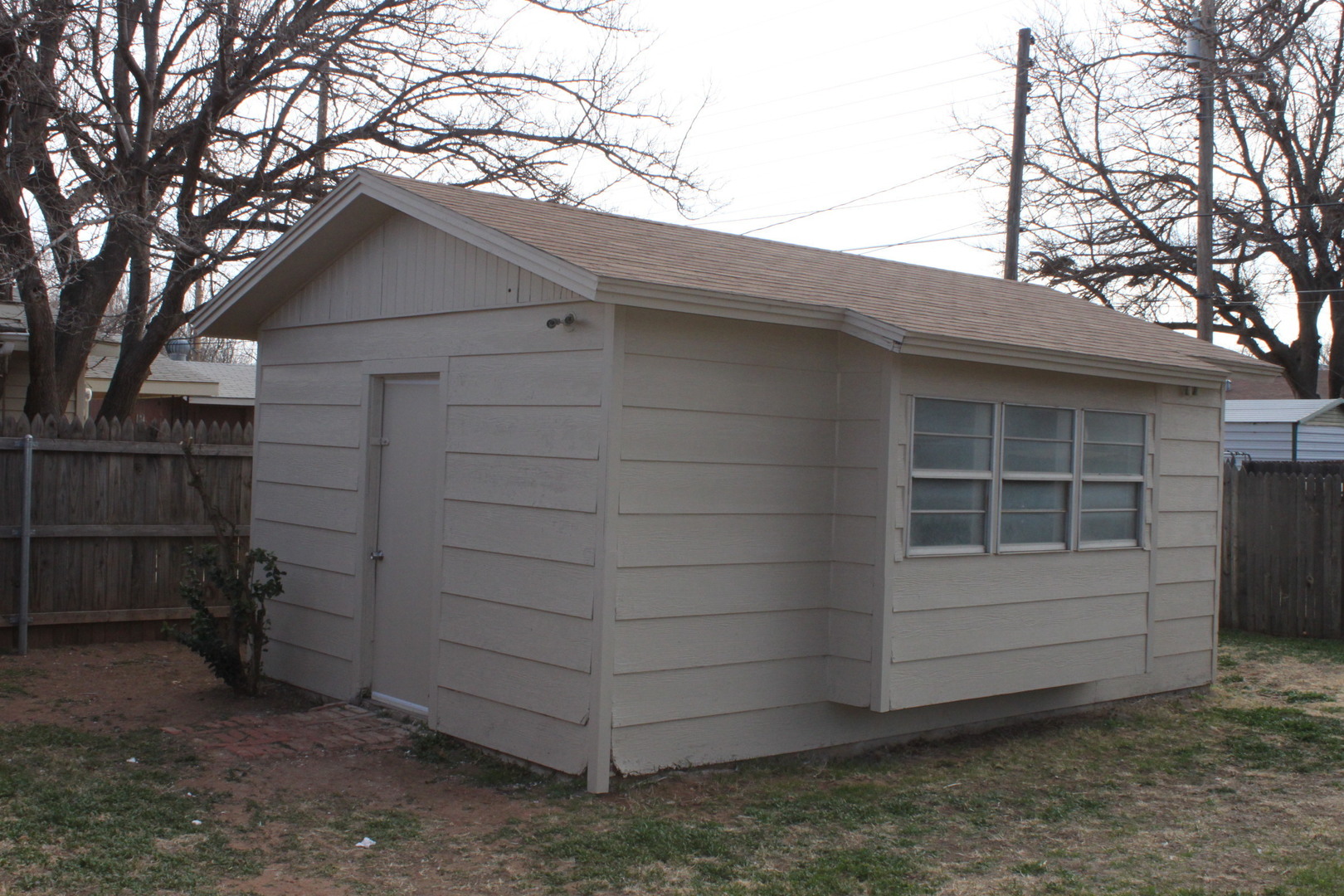 Large game room with electricity & window unit in backyard